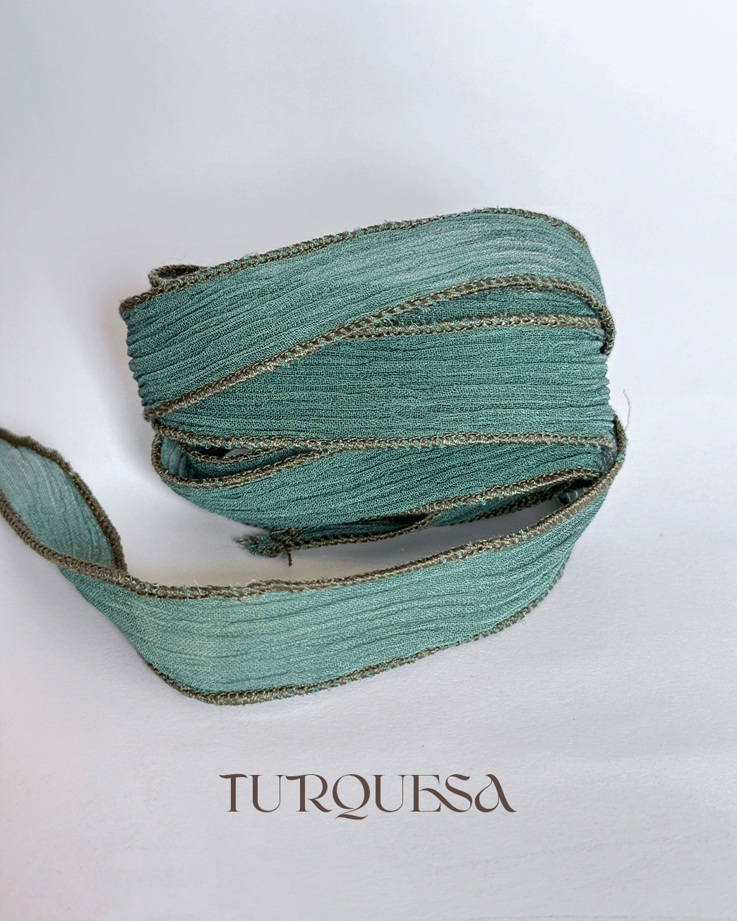 Una pieza artesanal compuesta por una cinta de seda teñida a mano principalmente con productos naturales como los cuescos y cascara de palta, borra de...
