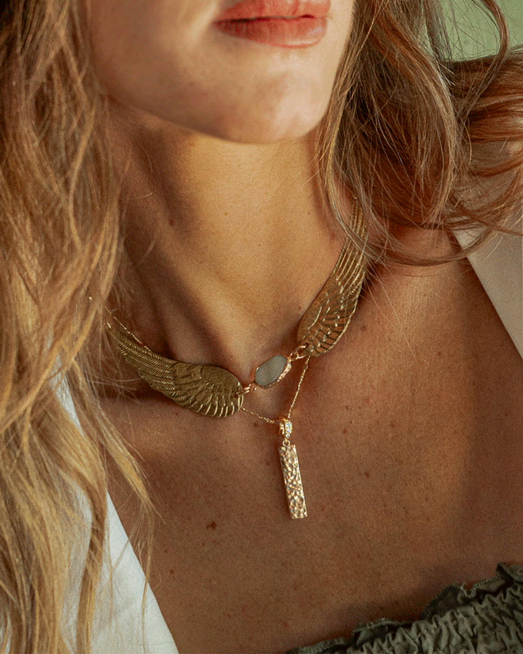 Collar con lingote dorado de textura irregular, trabajado artesanalmente para conservar la huella del metal y el gesto manual.Su forma sólida se transforma en tótem,...